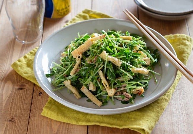 しゃきしゃきした豆苗のサラダに、油揚げのカリっとした食感、そして香ばしさも加わって、食べ応え満点です。