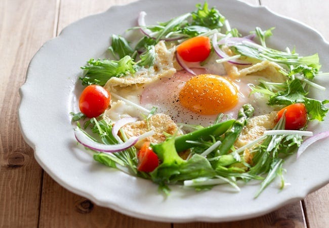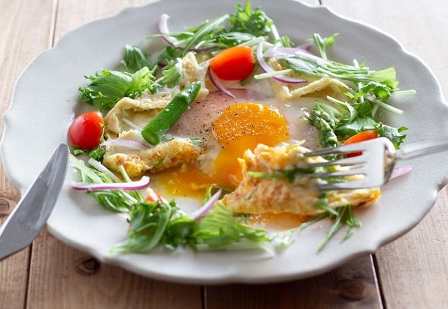 ③ 塩、黒こしょうをふり、白身が固まってきたら皿にもりつけ、サラダ用の野菜を散らして完成。
