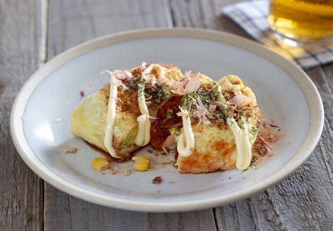 ③ お皿に盛り、お好みで青のりを振り、ケチャップなどをかけて完成。