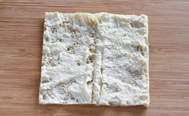 ② 縦に半分に切ってから、8mm幅に切る。アルミホイルなどにのせて、オーブントースターでこんがりと焼く。