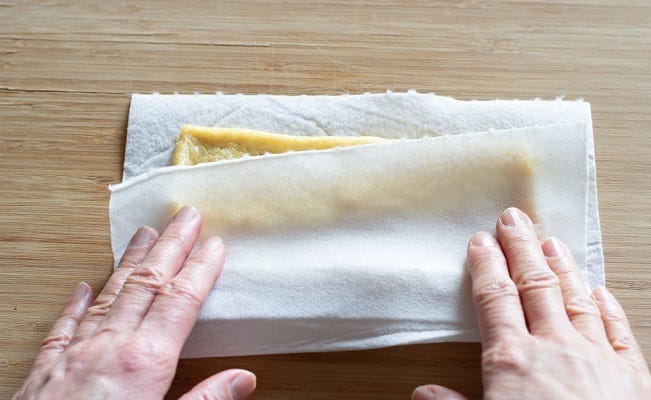 ① 油揚げは、キッチンペーパーで油を抑え、油分をとる。