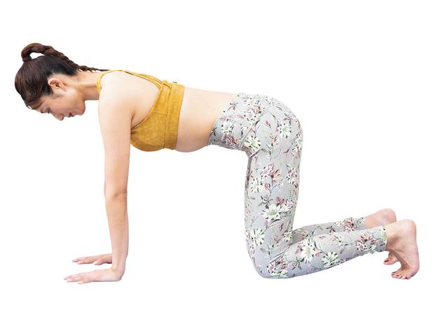 ①四つん這いになり、肩の真下に両手を、股関節の真下に膝をつく。膝は腰幅でつま先を立てる。目線は床に向けて、息を吸う。