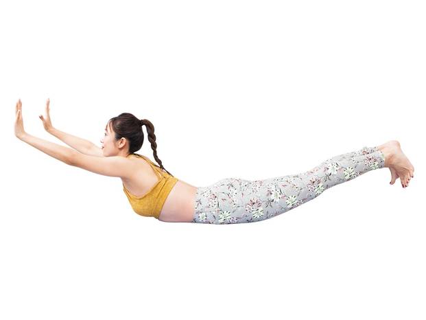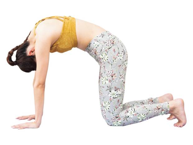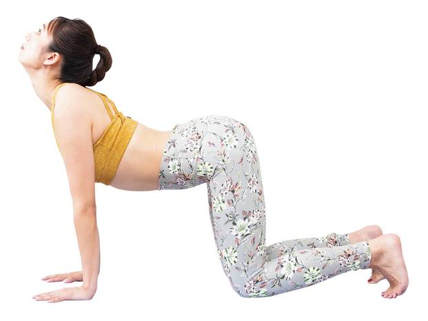 ③息を吸いながら頭と尾骨を持ち上げて、背中を弓なりに反らせる。胸を突き出して、あごを天井へ向ける。呼吸に合わせ②~③を5呼吸ずつ3回。