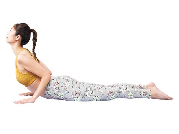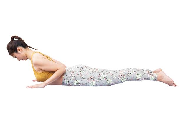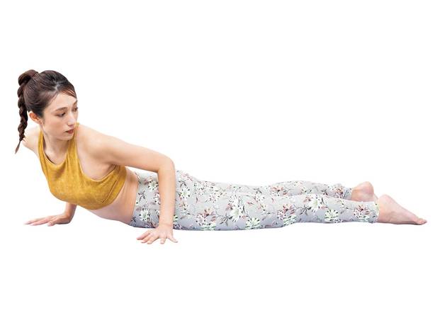 ④うつ伏せになり、足は腰幅に開く。両手を胸の横につき、上体を少し持ち上げてあごを引く。