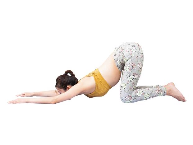 ②息を吐きながら、両手で床を押して、おへそを引き上げ、肩甲骨を広げるイメージで背中を丸める。頭はおへその下のほうへ引き込む。