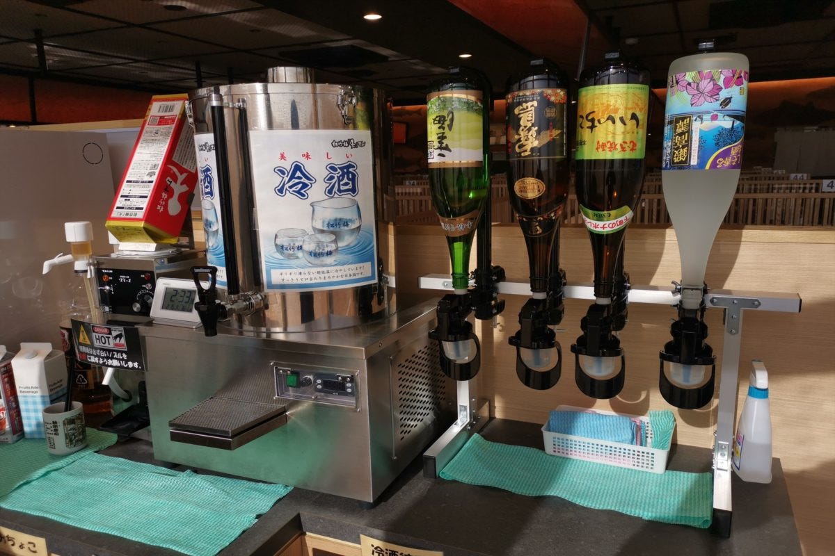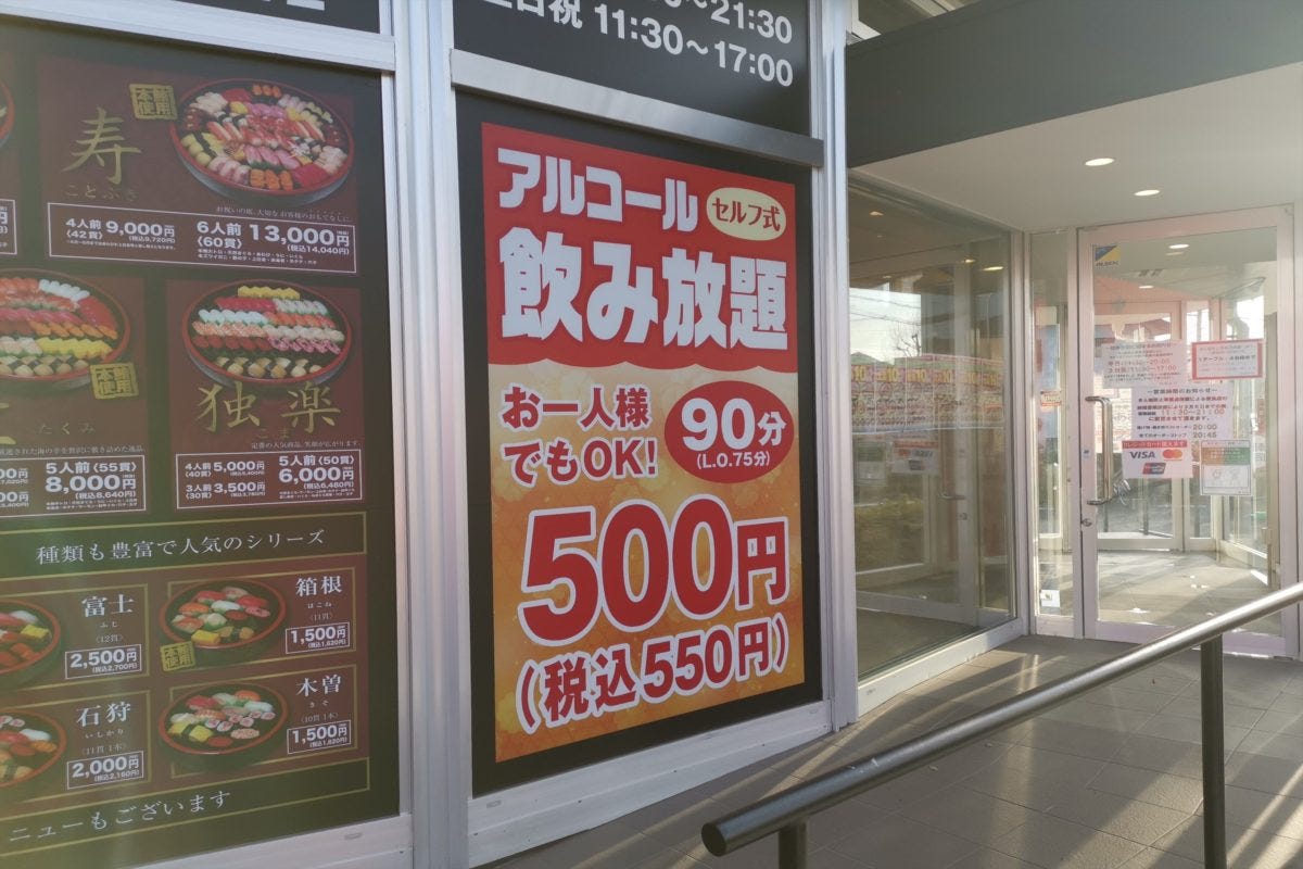 独楽寿司は500円飲み放題で有名なチェーン店で、セルフ式だが90分とひとり飲みとしてはたっぷりの時間。