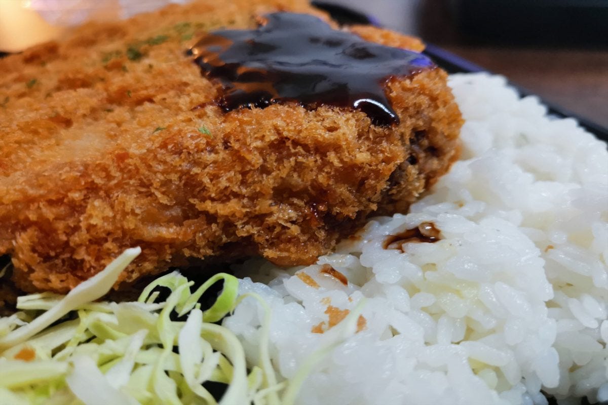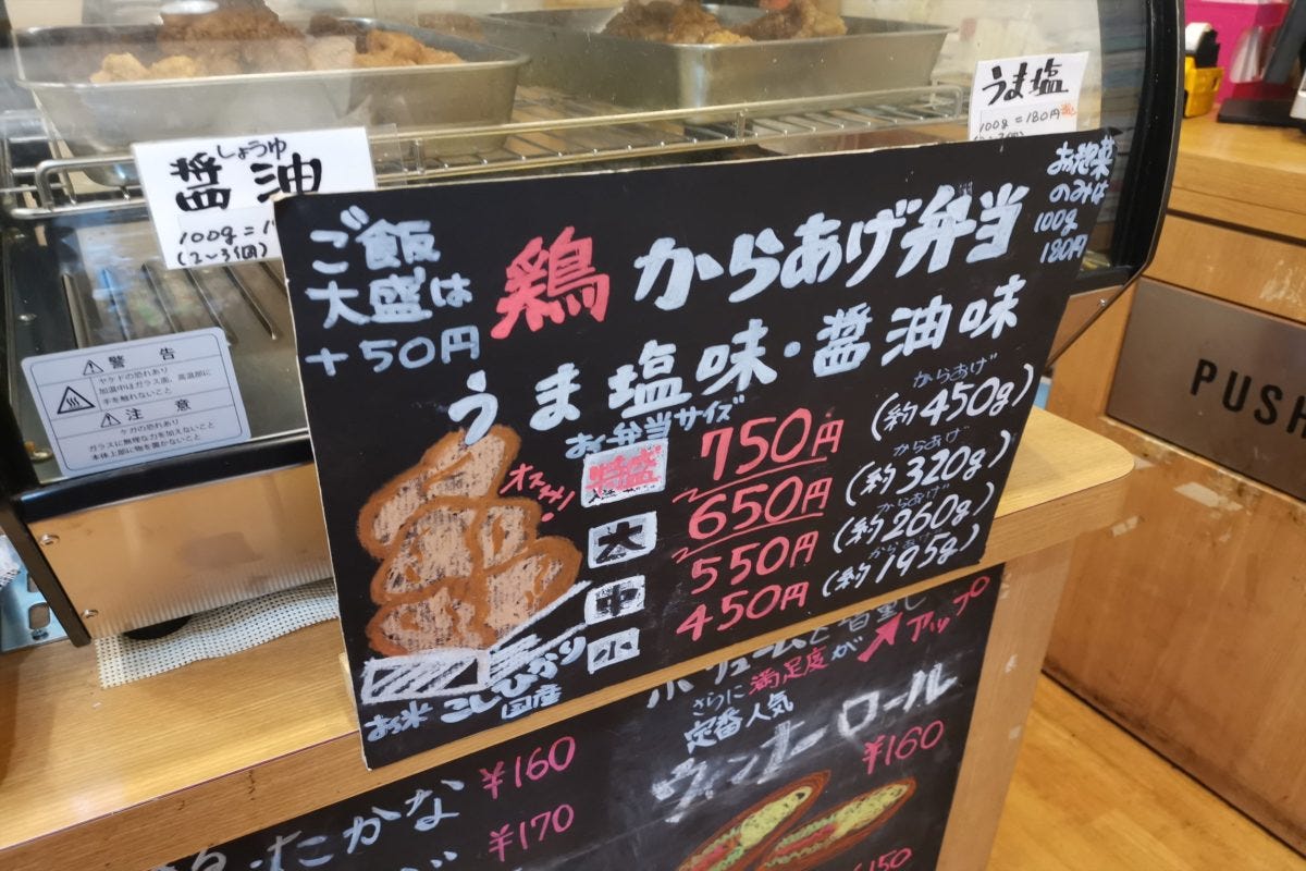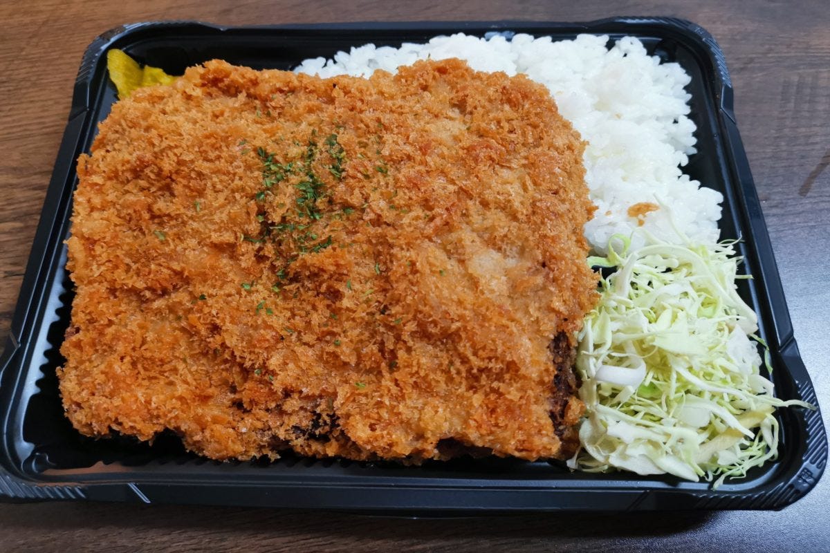 また、からあげ弁当以外の弁当も、サイズ感がどれもおかしなことになっており、全力で胃袋を破壊しにきていることがわかるボリューム感。こちらのメンチカツ弁当は、丸く作ればいいのにわざわざ量が増える四角形であげており、ご飯の領域を3分の2ぐらい浸食している。