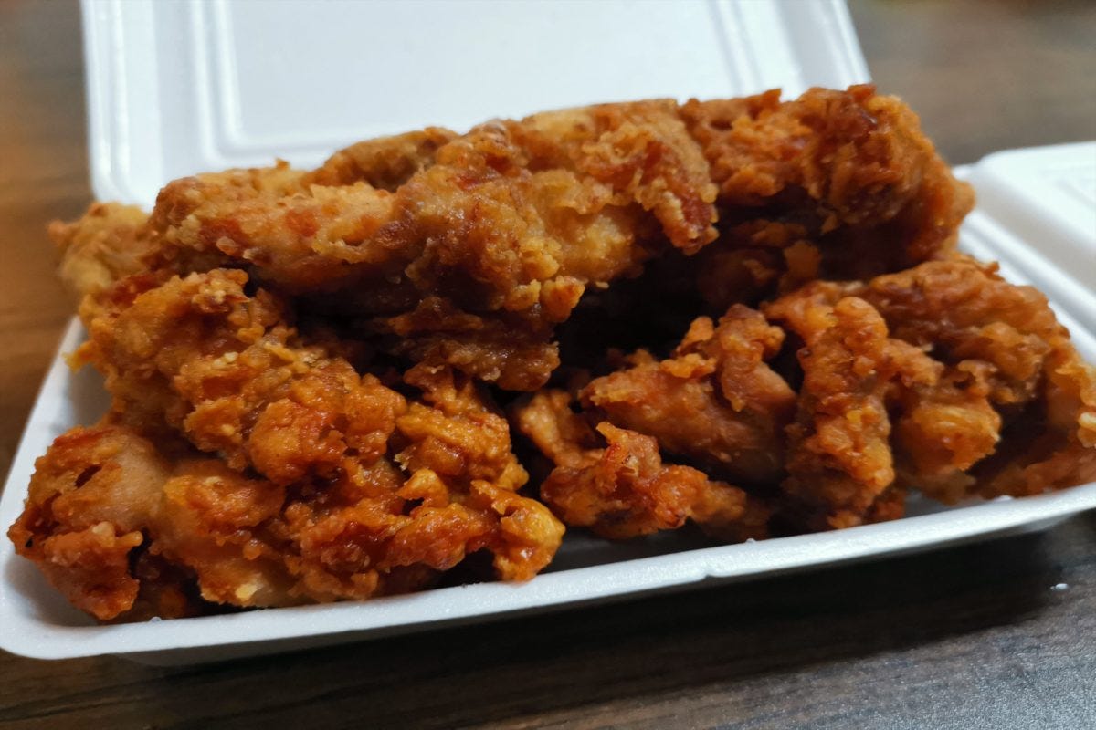 からあげのサイズは450グラムでフタの意味がほぼない状態で提供される。からあげ単品でも安いのに、これにほかほかのご飯がついてくるのだからたまらない。味もオーソドックスでご飯に合うタイプなので最高だ。