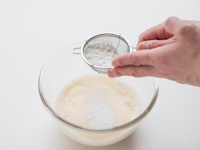 牛乳とバターを小鍋に入れ沸騰直前まであたためたら卵液にすこしずつ加え混ぜる。小麦粉も茶こしなどでふるい入れ手早く混ぜる。