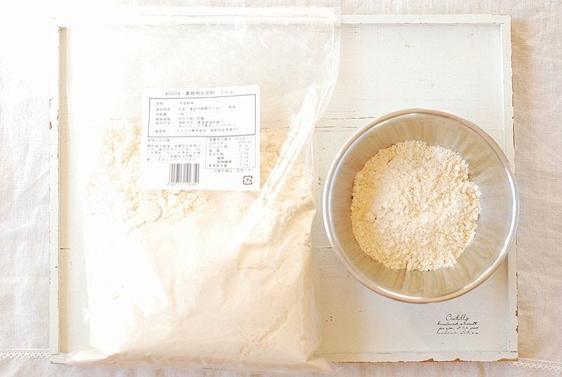 大豆粉は大豆を挽いて粉にしたもので、糖質は小麦粉の四分の一しかありません。