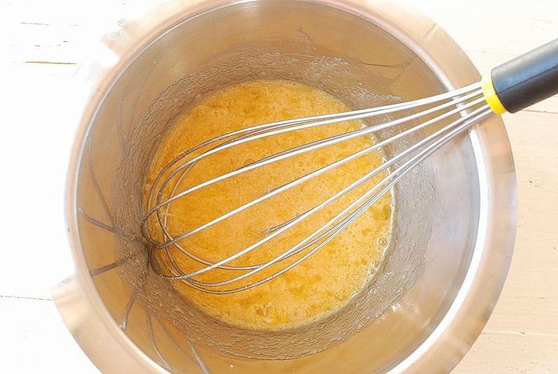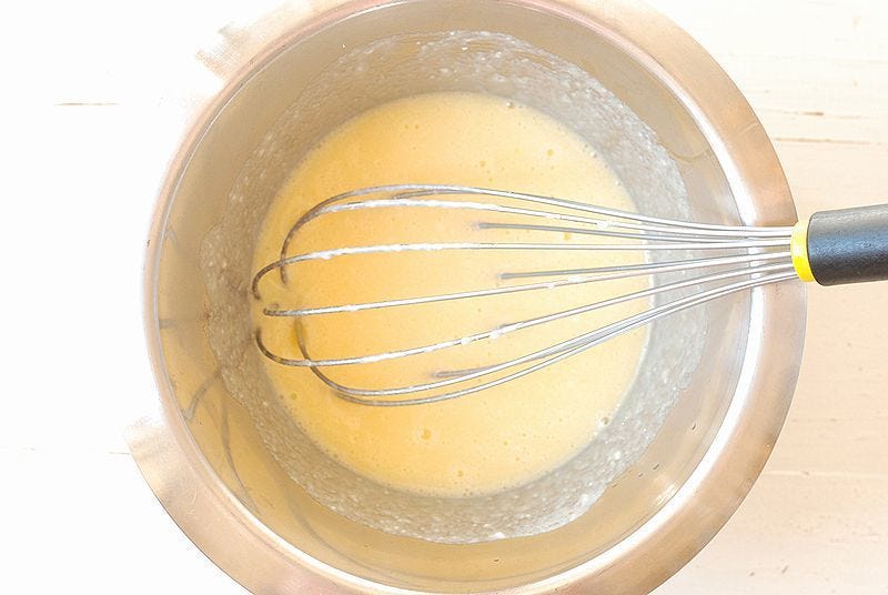 ② ボウルに卵とラカントSを加え、白っぽくなるまで泡立て器でよく混ぜる。