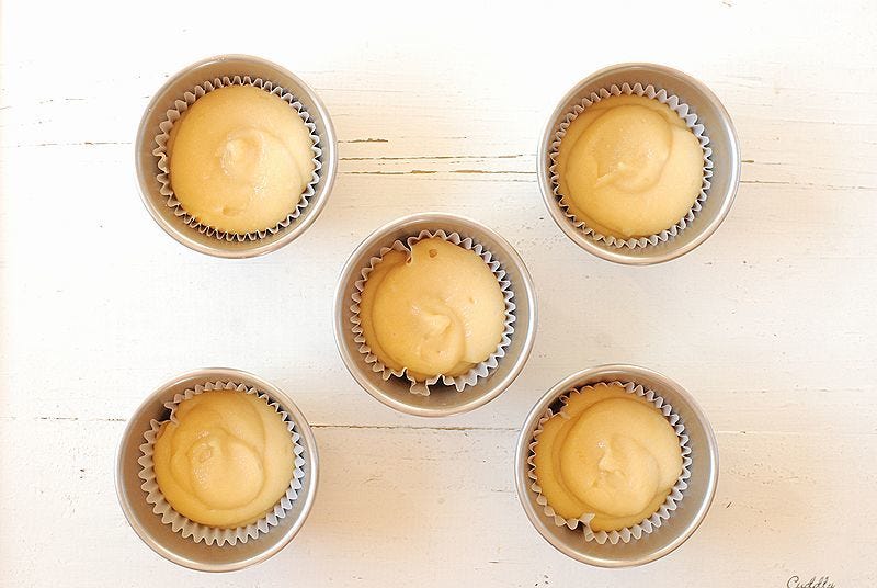 ⑤ 生地を型の8分目までスプーンや絞り袋等を使って入れ、蒸気が上がった蒸し器で約14分、中に火が通るまで蒸す。