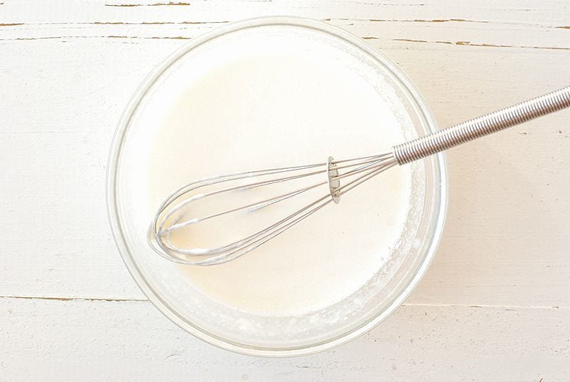 一度取り出しゴムベラで良く混ぜ、再度レンジで40秒加熱して混ぜチーズを完全に溶かす。サラダ油を少しずつ加え泡立て器で良く混ぜる。