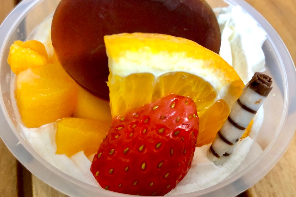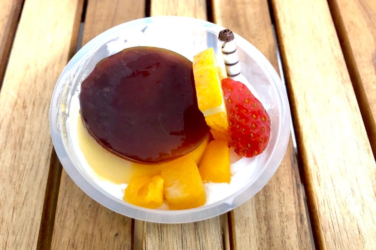 プリンは弾力が硬めで、ケーキスポンジは甘め。果物のジューシーさが加わり大満足です。コンビニプリンのレベルを、超えているのではないでしょうか。