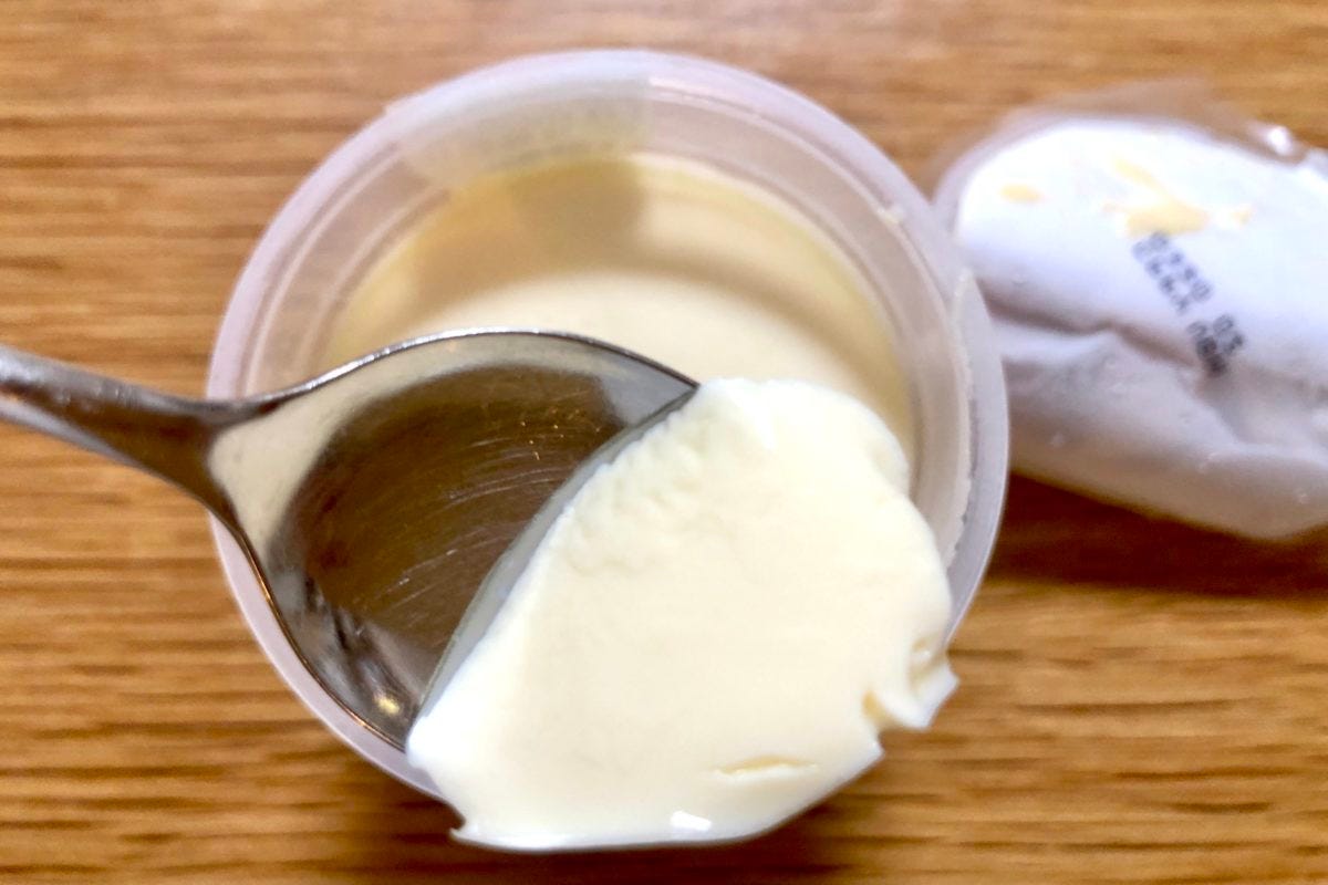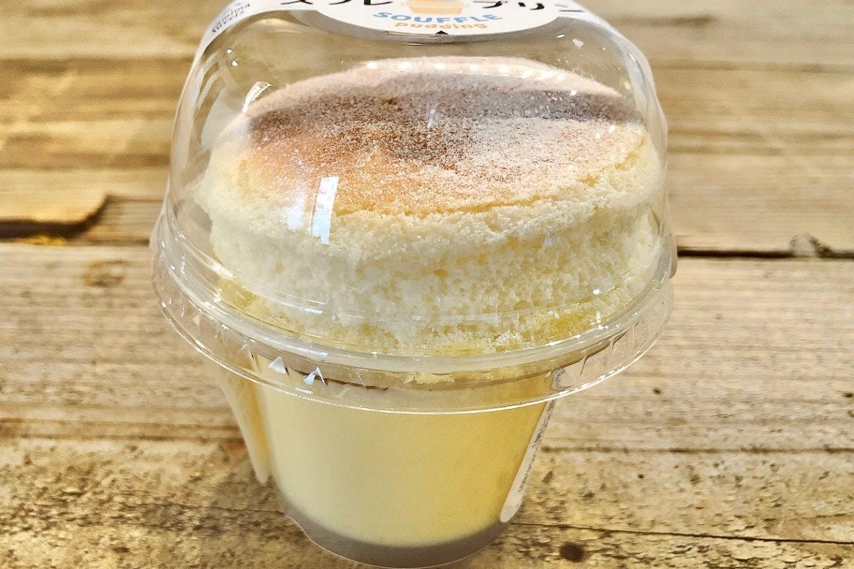 カスタードプリンに、スフレをがっつり乗せた大胆な構造で、その間を生クリームで繋いでいる同商品。ふわふわで甘いスフレと、さっぱりめのプリン・生クリームがちょうどいいバランスでした。