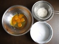 オーブンを160℃に予熱します。オーブンペーパーをケーキ型の底と周囲に敷いておきます。薄力粉はふるっておきます。卵と卵黄は室温に戻します。