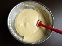 薄力粉を加え、ゴムべらで底からかえすように、よく混ぜ合わせます。