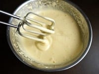 ボウルに卵、卵黄、グラニュー糖、はちみつを入れ、湯煎で温めながら、ハンドミキサーの低速で全体が白っぽく、もったりしてくるまで泡立てます。約倍量になるまで、およそ10分くらい泡立ててください。