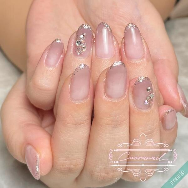 クリアジェルのべた塗りにすると少し寂しい感じになりがちですが、ラインストーンを散りばめるだけで十分華やかな雰囲気に!