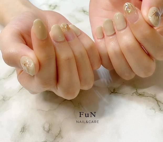 まずご紹介する、指が太く見えないネイルデザインは、2月はもちろんオールシーズンおすすめのベージュのワンカラーネイルです。