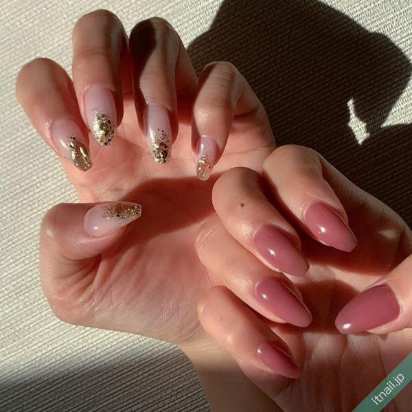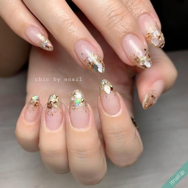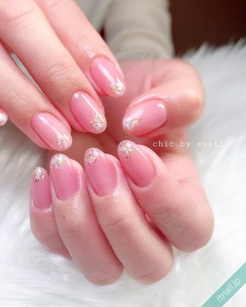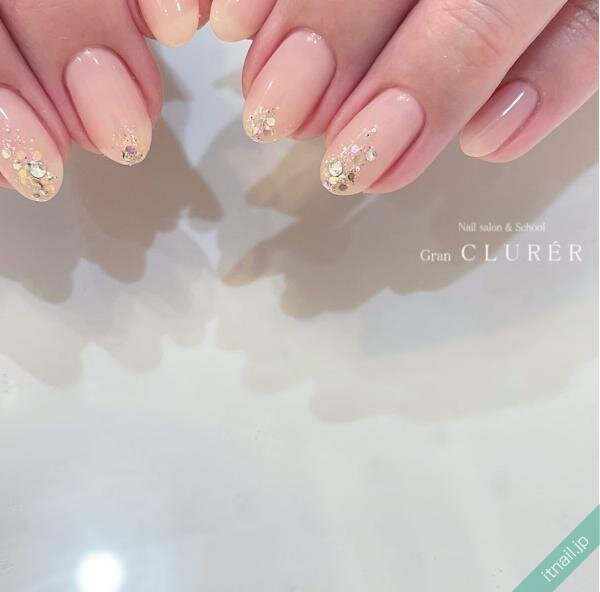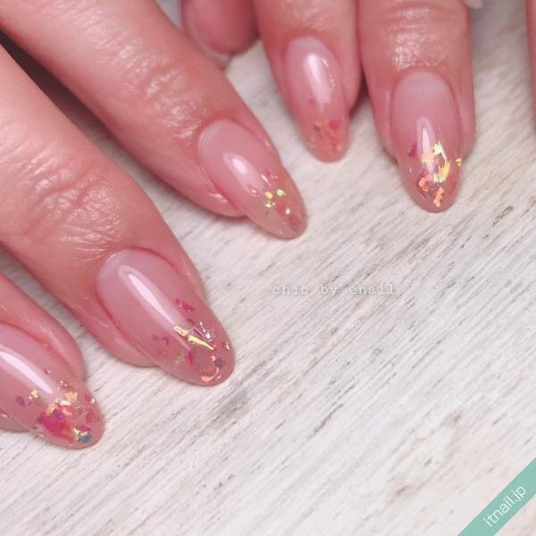 透明感のあるピンクで、ホログラムなどのキラキラを引き立たせるのもGOOD♡グラデーションネイルをベースにして、先端にぎゅっと詰め込むと、幻想的で可愛いですよ。ピンクベージュやコーラルピンクなら多くの方がチャレンジしやすいです。