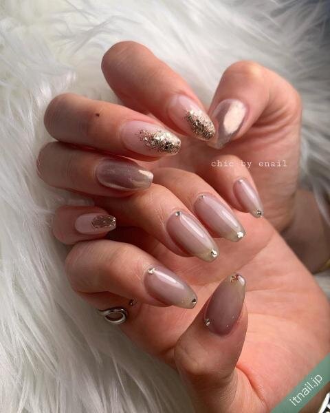 エレガントなネイルなら、ゴールドラメをたっぷり使っていきましょう♡ラメが映えるクリアカラーをベースにするのがおすすめ♡存在感はありますが、クリアカラーがすっきり見せてくれるので、バランスのとれた大人ネイルになります。
