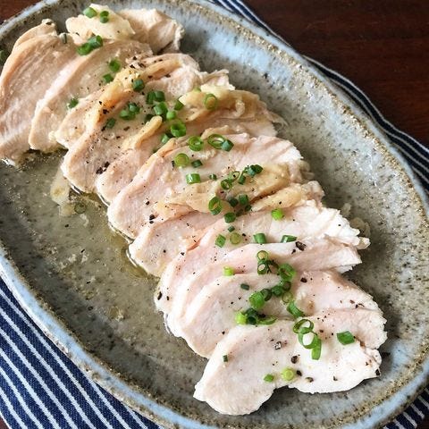 耐熱容器に調味料と胸肉を入れて、電子レンジで10分ほど加熱すれば完成。生の場合は追加で加熱しますが、最後は余熱で火を通すことでパサパサになりません。