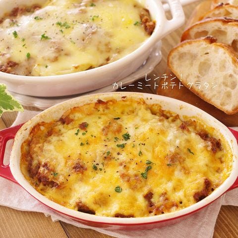 カレーミートポテトレシピは、合い挽き肉やスライスしたじゃがいも、みじん切りにした玉ねぎ、調味料などすべて混ぜて耐熱皿に入れたら、電子レンジで9~10分加熱すれば完成します。