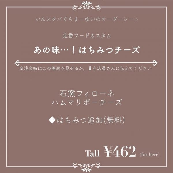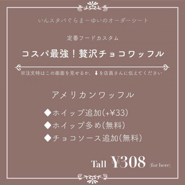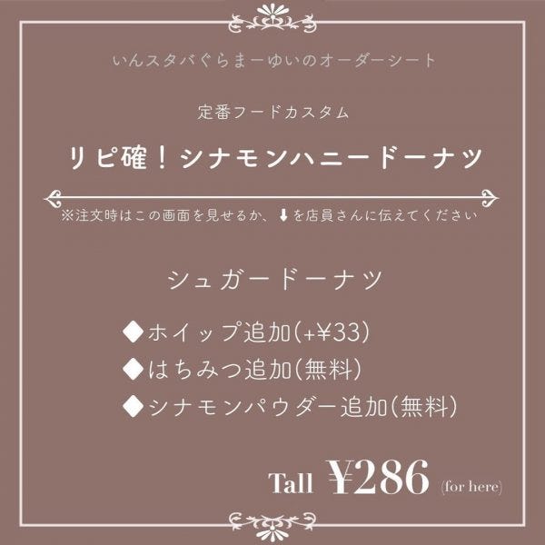 ちなみにカスタムの定番「ホイップ追加」は、ドリンクだと+¥55ですが、フードだと+¥33で¥20安くてお得です♪