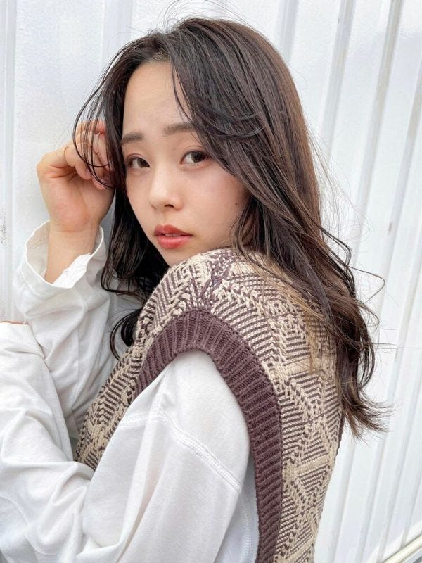 前髪なしの大人っぽいミディアムに暗めアッシュブラウンを合わせると、ほんのりと柔らかい印象になってさりげないおしゃれ感がアップします。