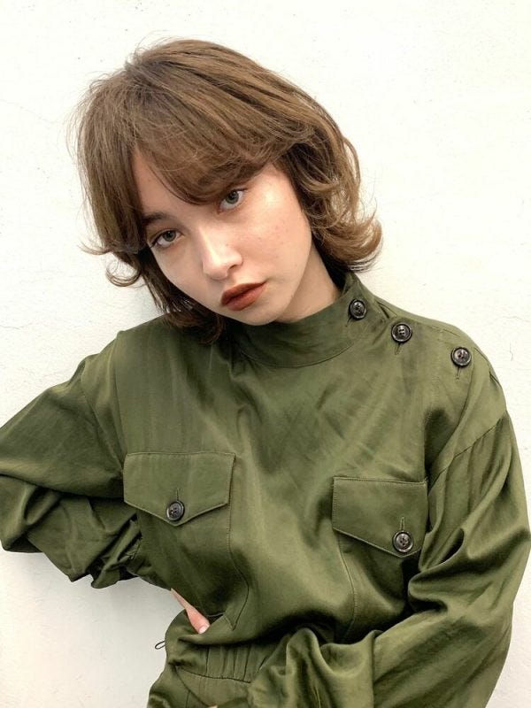 重めなレイヤーカットのボブはアッシュブラウンで、くすみ感を出して柔らかい印象にするのがおすすめ。