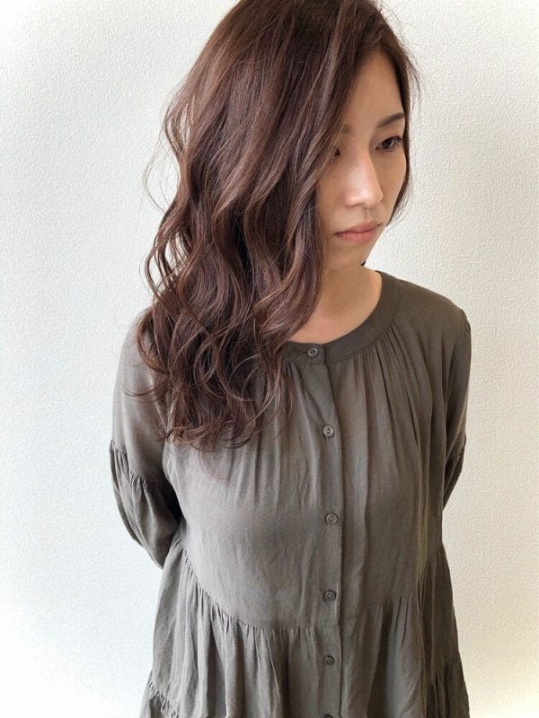 大きめウェーブの前髪なしセミロングは色っぽく華やかですが、アッシュブラウンで柔らかさを出すと落ち着いた印象にもできますよ。