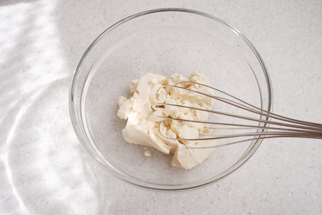 ① ボウルに絹ごし豆腐を入れ、クリーム状になるまで泡立て器で混ぜる。