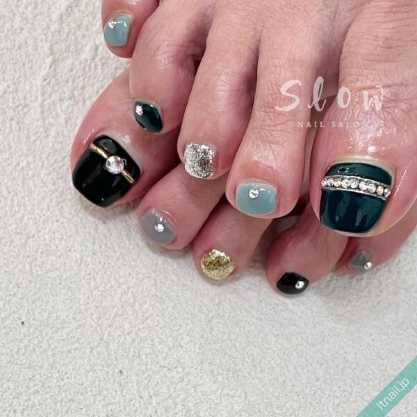 ストーンを使ったリングデザインは、華やかなフットネイルが好みの方にぴったりです。同じくトレンドの深いグリーンカラーをベースに、シルバー系のストーンを入れるのがおすすめ♡大人っぽくて上品なフットネイルの完成です。