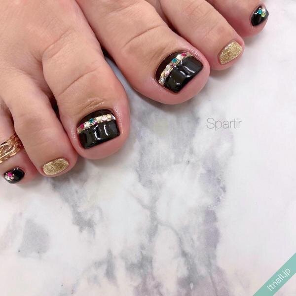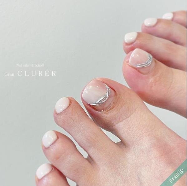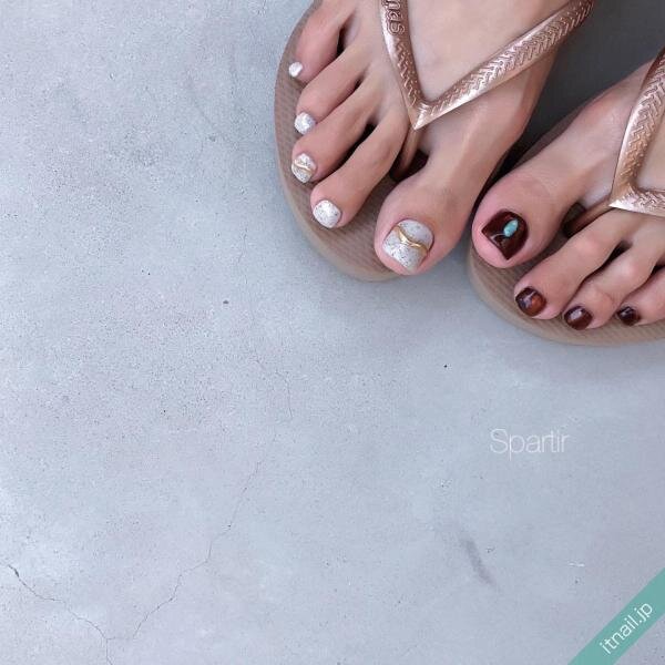 トレンド感が増すアシメデザインのフットネイルもおすすめです。どちらか片方の爪にゴールドリングを入れるだけで、パッと明るくなります。少し凸凹感を出すなどして、おしゃれ度を上げるのもおすすめです。
