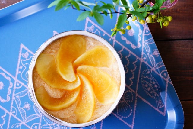 ⑤ トッピング用にリンゴのコンポート(できれば薄切りにしておく)を乗せて、空気を抜くようにトントンと型を数回落とし、180℃に余熱したオーブンに40~50分入れて焼く。