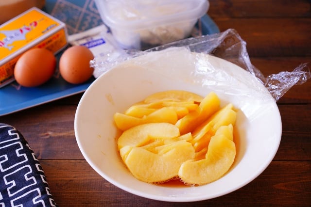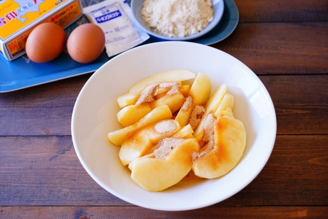 リンゴは生のままでも良いのですが、水分が出るので今回はレンジでコンポートにしました。