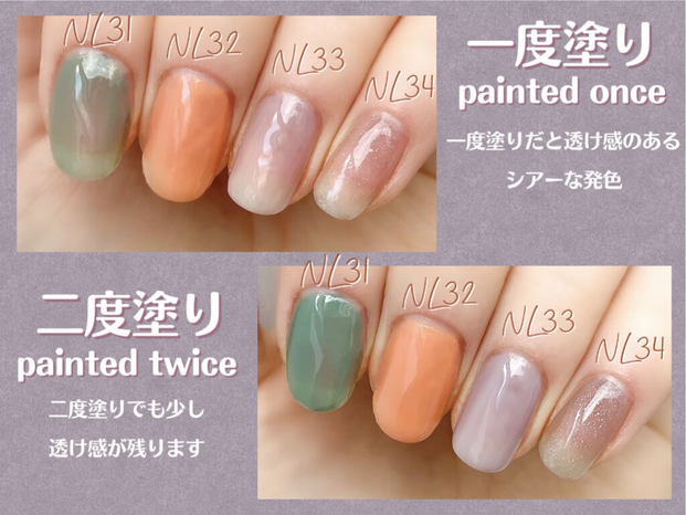 そんなエクセルのイチオシカラーは、NL31 バジルリーフ。若葉のようなフレッシュな色味が爽やか!シアーな質感なので、のっぺりしやすいグリーンも軽やかな印象に仕上がるのも推しポイントです。