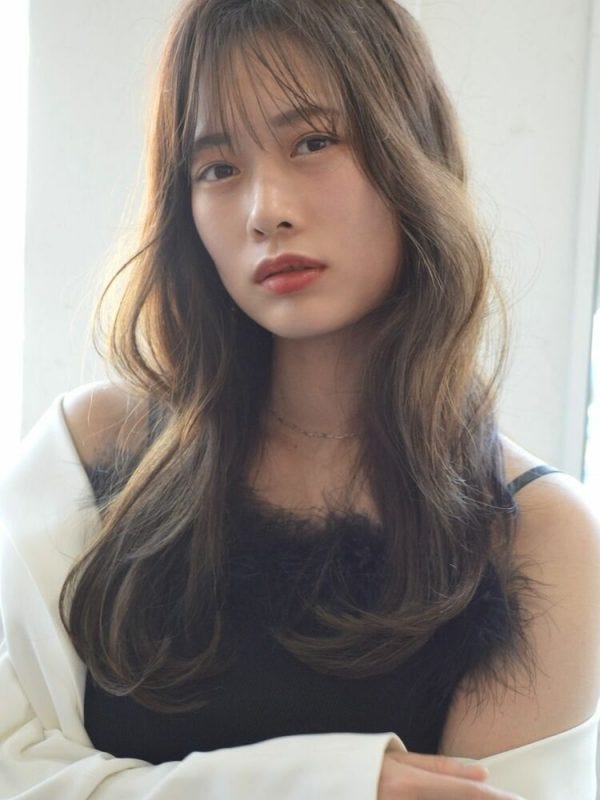暗髪で落ち着いた雰囲気のため大人女性に似合いやすくコテで巻いて全体を整えてあげると、ふんわりとしたロングになります。