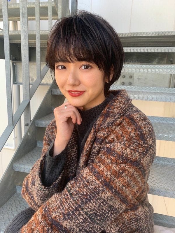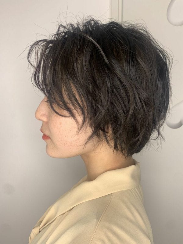 暗髪のマッシュショートは大人女性にも似合うレディースヘアであり、くせ毛さんにもぴったりですよ。
