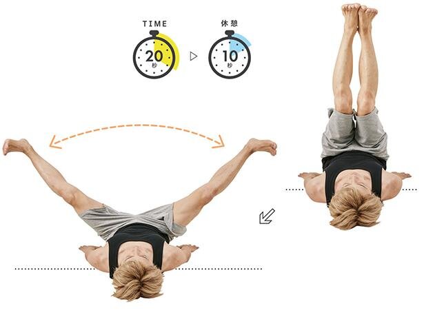 そのまま脚を開いて閉じる、これを20秒間続ける。脚の開き幅が同じくらいになるように意識。