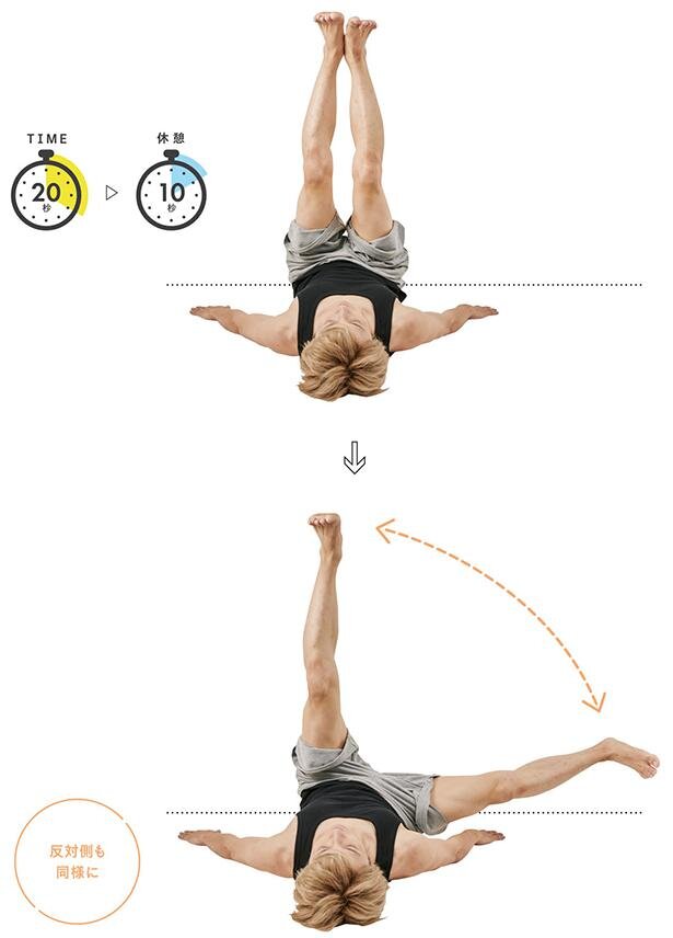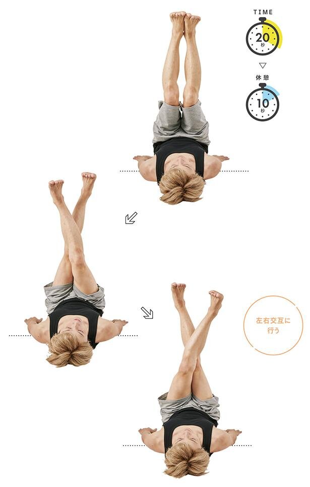 1と同じく、仰向けに寝て、両脚を床と垂直になるように上げる。脚を開いてそのまま通り過ぎるようにしてクロスさせる。1回ごとに左右を入れ替えて。20秒間続ける。