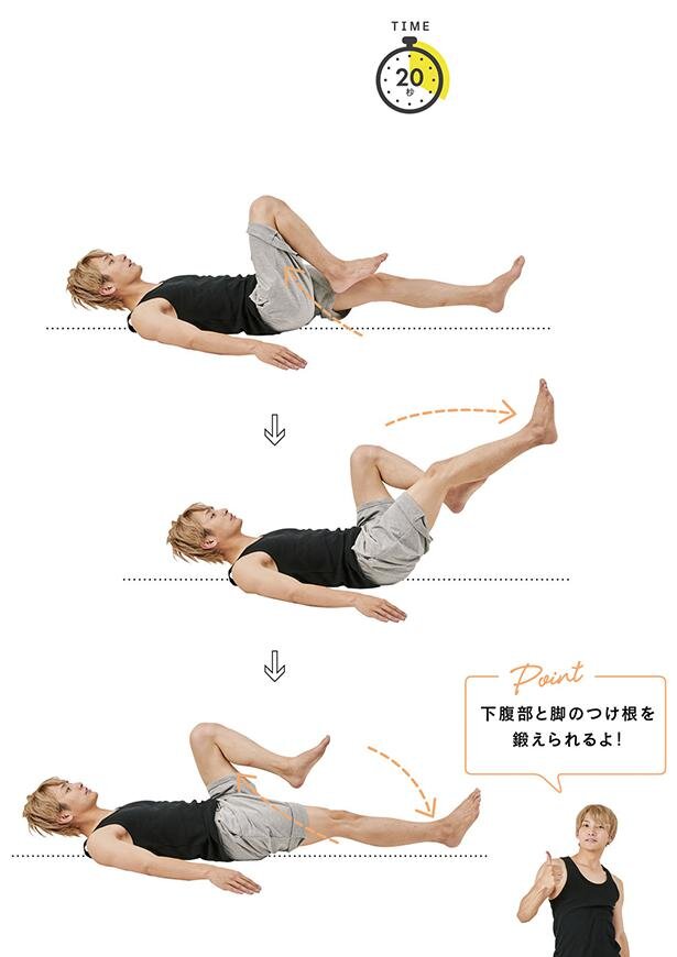 仰向けに寝た状態で両手は床につけて、肩は床から離しておく。脚を伸ばして、少し床から上げて片方の脚は曲げる。20秒間自転車をこぐように脚を回転させていく。かかとは床につかないように大きく動かして。