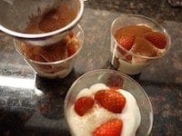 フィンガービスケット、マスカルポーネチーズ、食べやすい大きさにカットしたいちごを重ね、カカオパウダーをふります。