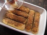 型に並べたフィンガービスケットにまんべんなくコーヒー液をかけ、浸しておきます。