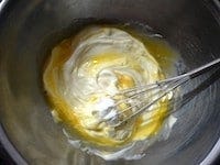 卵黄をマスカルポーネチーズに加え、完全に混ざるまでゴムべらでよく混ぜます。