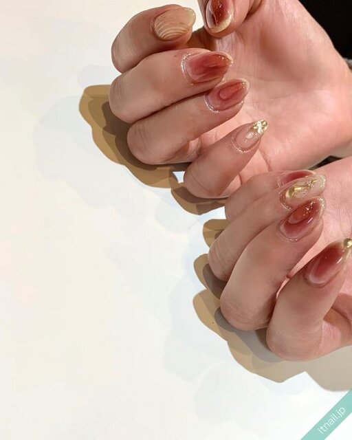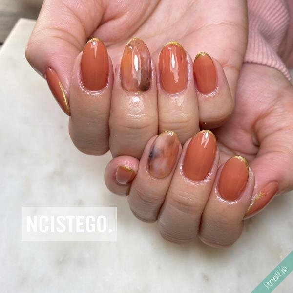 シアーなテラコッタカラーなら、艶やかさが倍増してうるうるに輝きます。指先に細くラメラインを入れることで、指先に視線が集まります。ポイントで取り入れたマーブルでこなれ感アップ。
