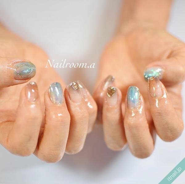 海を思わせるようなシアーブルーも、ベージュと合わせることで穏やかな印象に。塗りかけネイルの特徴を活かして、上手く余白を作って軽やかさを。ラメやミラーネイルを重ねて満足感の高い手元に。