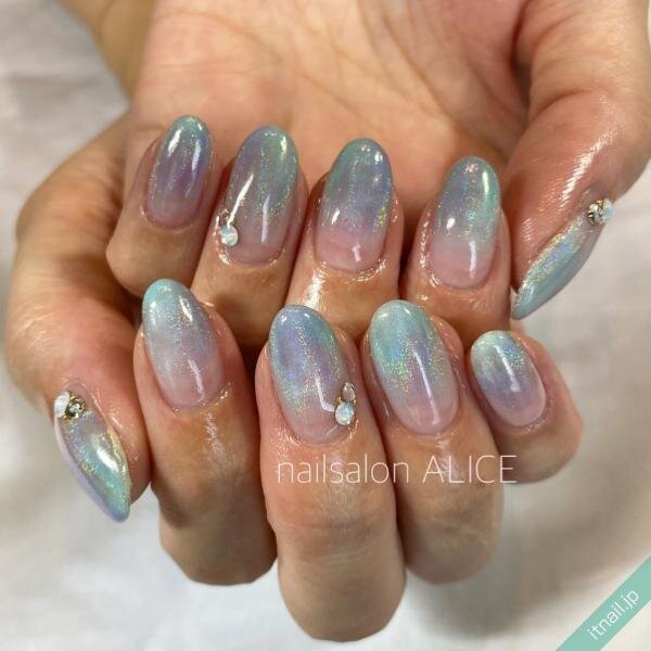 角度によって複雑に色が変化するオーロラカラーが神秘的なデザイン。シアーなブルーで爽やかに。思わず指を光に照らして動かしたくなる輝きが魅力です。