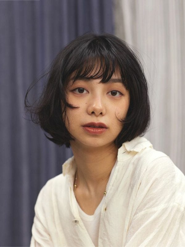 トレンドライクなパーマ前髪を加えた黒髪ボブ